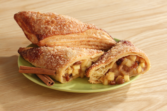 · Leg de plakjes bladerdeeg op het werkvlak en leg op elk plakje een schep van het appelmengsel